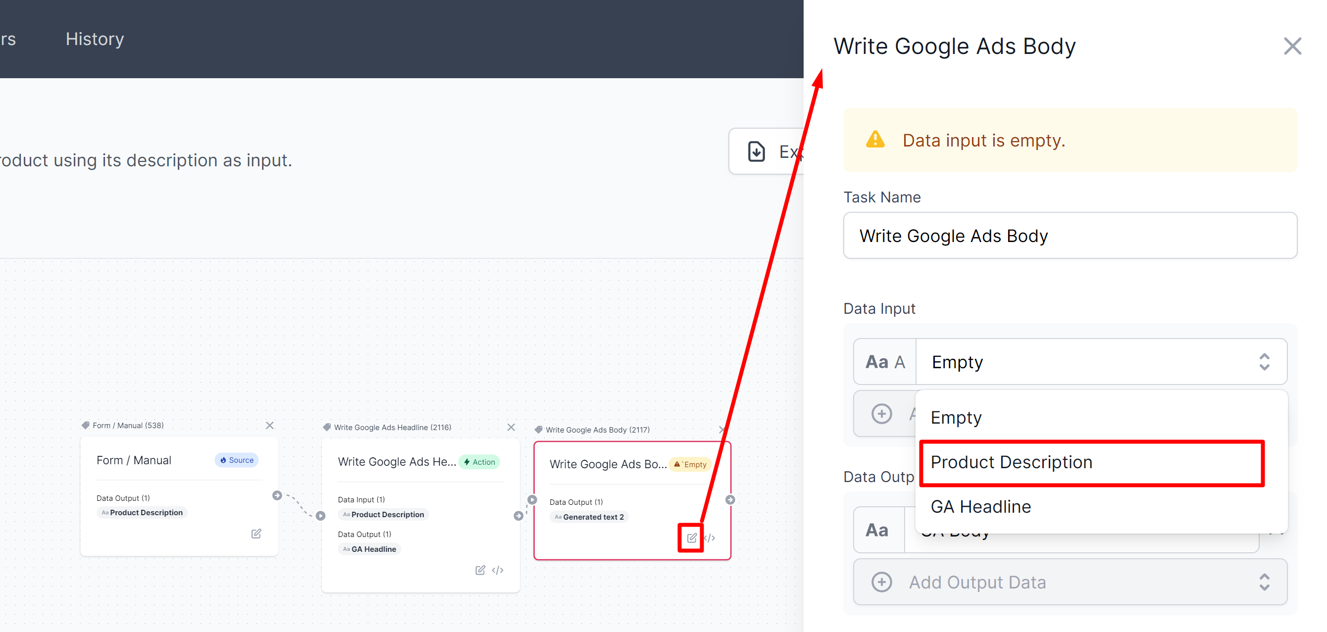 Let’s create a simple workflow, that generates Google Ads for our products. It will require only a brief product description as input.