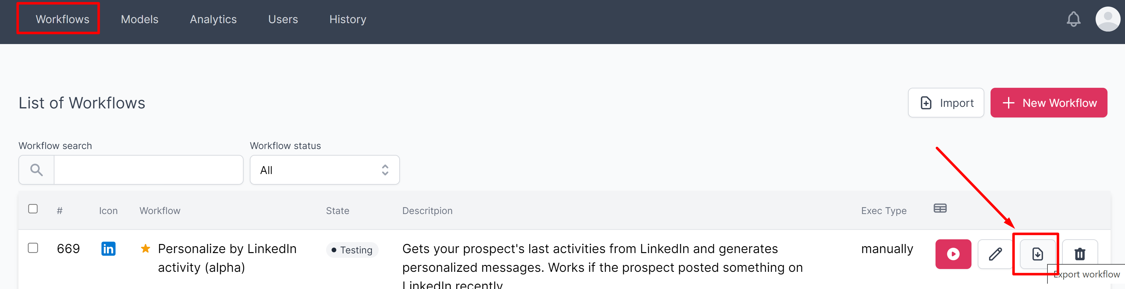 Now your newly imported workflow appears in the list of workflows.