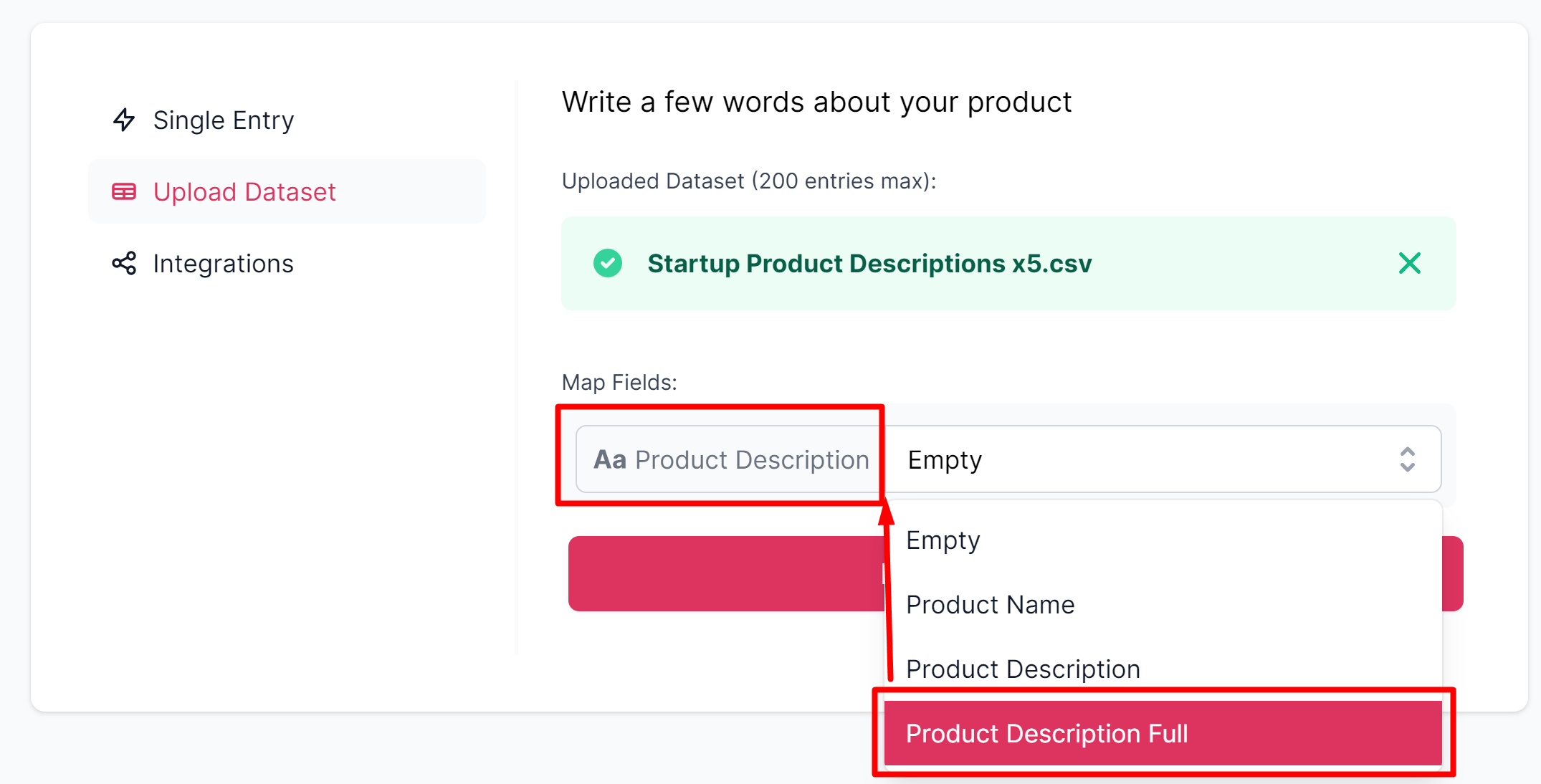 Click the <mark style="background-color:blue;">**“Upload Dataset”**</mark> button to start matching fields.