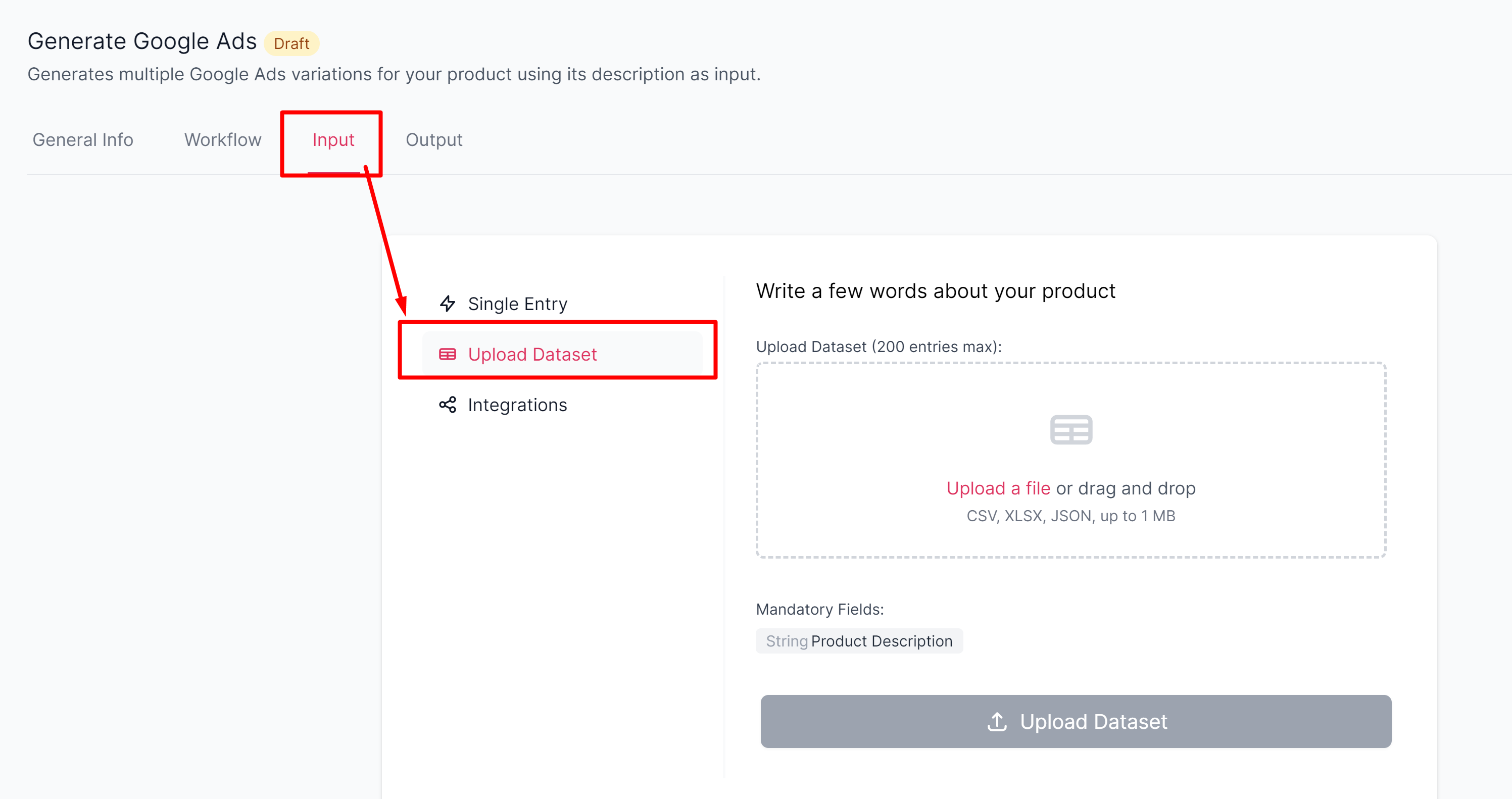 Choose the <mark style="background-color:blue;">**"Upload Dataset"**</mark> input option: